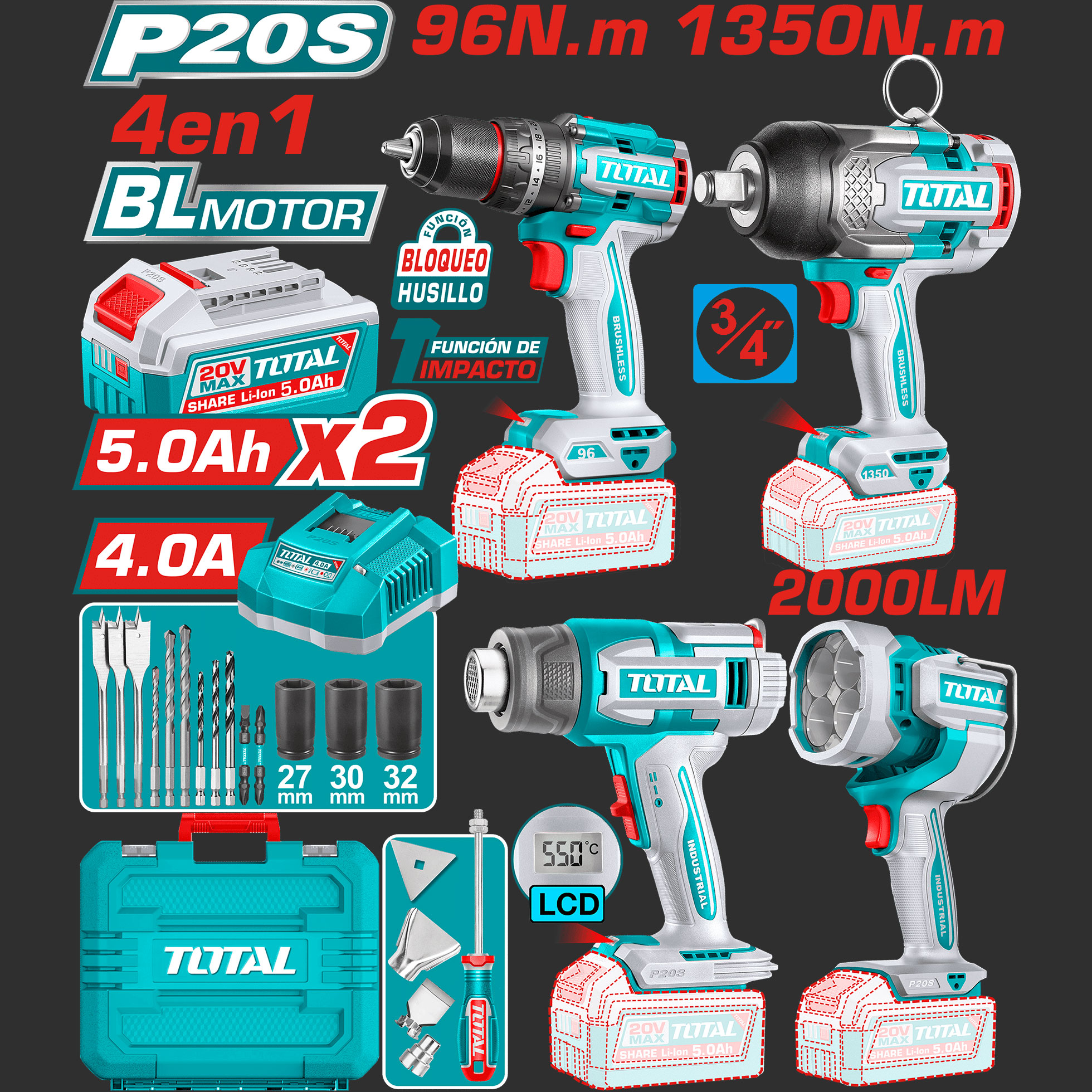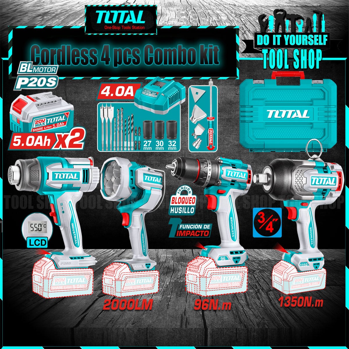 I don't know my zip codeCordless 4pcs Combo Kit – Impact Drill 96Nm – Impact Wrench 3/4″ 1350Nm – Work Lamp Flash Light 2000LM- Heat Gun LCD Display – 2x 5.0 Ah Batteries 1x Fast Charges 4.0Ah Brushless with Case TOSLI250608
