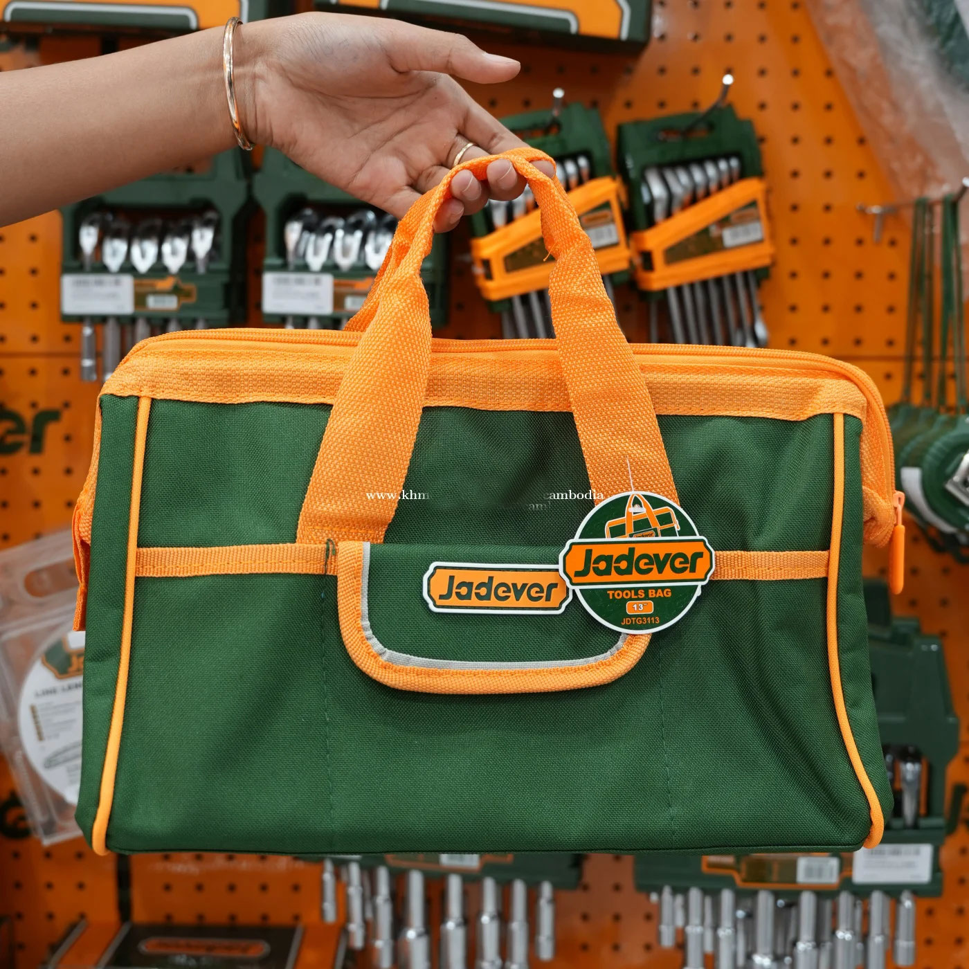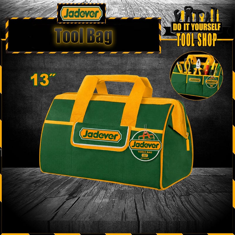 The Jadever 13″ Tool Bag (model JDTG3113) is a compact tool storage bag made of 600D polyester, with a rigid frame, multiple outer pockets, and a maximum load capacity around 8 kg — suitable for hand tools and general use.